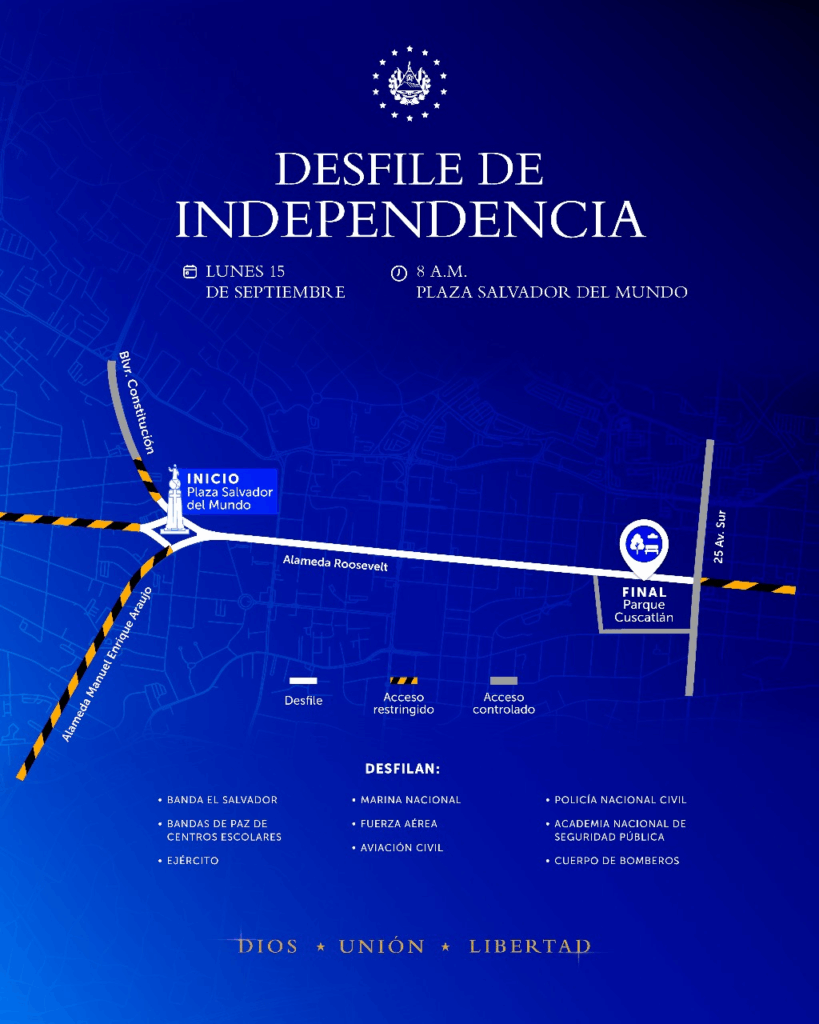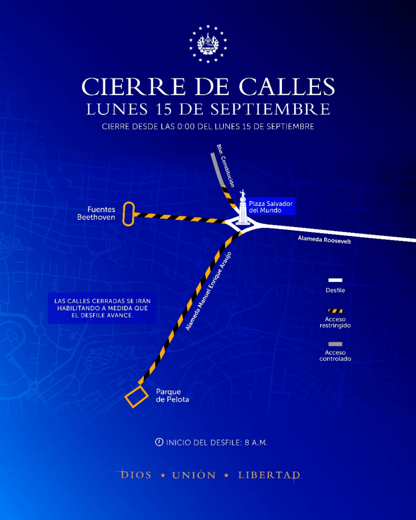 El Viceministerio de Transporte informó que, como parte de los preparativos para conmemorar los 204 años de independencia, se ejecutará un dispositivo especial de gestión vehicular en San Salvador desde la medianoche del próximo lunes 15 de septiembre.