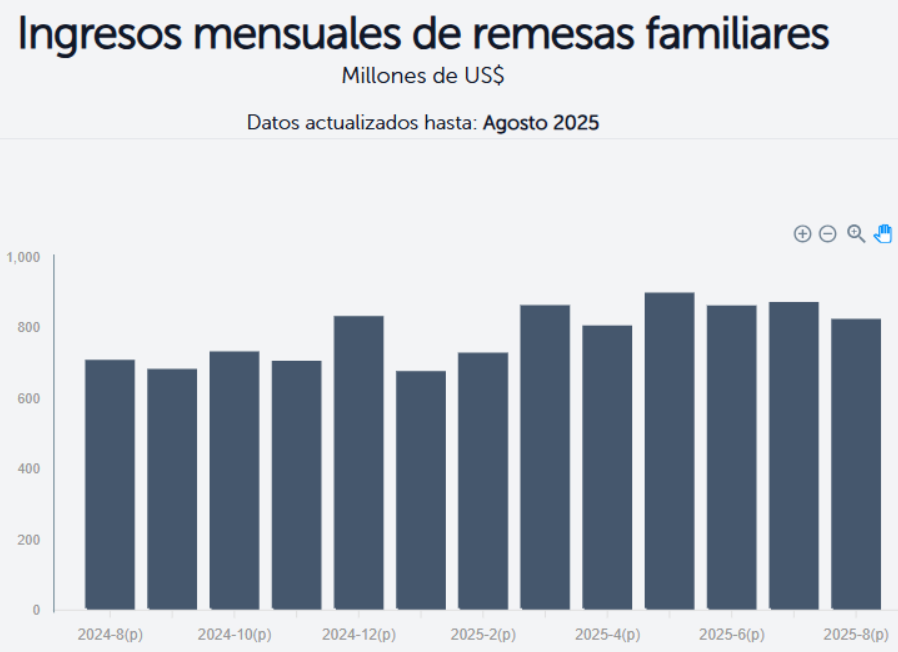 El Banco Central de Reserva de El Salvador (BCR) dio a conocer el más reciente informe sobre las remesas familiares recibidas en El Salvador, que alcanzaron para el mes de agosto 2025 un total de US$824.97 millones.