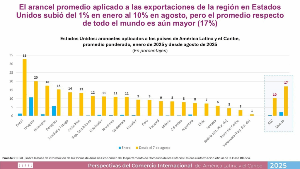 El Salvador enfrenta un incremento significativo en los aranceles aplicados por Estados Unidos a sus exportaciones, que pasaron de prácticamente 0 % en enero a 11 % a partir del 7 de agosto de 2025, según datos de la Comisión Económica para América Latina y el Caribe (CEPAL).