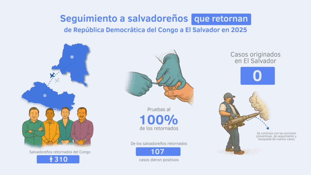 De acuerdo con la institución, se realizaron pruebas al 100% de los retornados, lo que permitió identificar oportunamente los casos importados y evitar riesgos de propagación. Gracias a esta vigilancia estricta, el Ministerio de Salud confirmó que no se registran casos autóctonos en El Salvador.