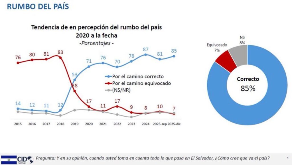 En materia de seguridad, los resultados reflejan un consenso casi total: el 96 % de los salvadoreños apoya las medidas implementadas contra las pandillas, manteniendo una tendencia ascendente desde 2022. CID Gallup subraya que este respaldo representa el porcentaje más alto registrado durante el período evaluado.
