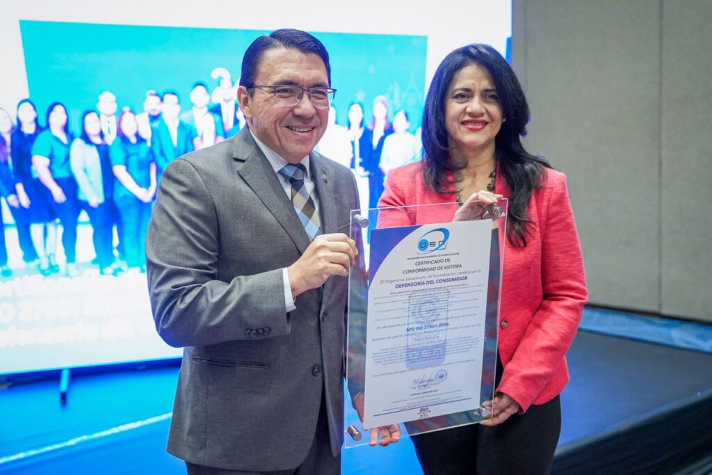 En el marco de la presentación de estos resultados, la Defensoría del Consumidor recibió la certificación del Sistema de Gestión Antisoborno, conforme a la norma internacional ISO 37001:2016, otorgada por el Organismo Salvadoreño de Normalización, un reconocimiento que refuerza los procesos de transparencia y el uso responsable de los recursos públicos.