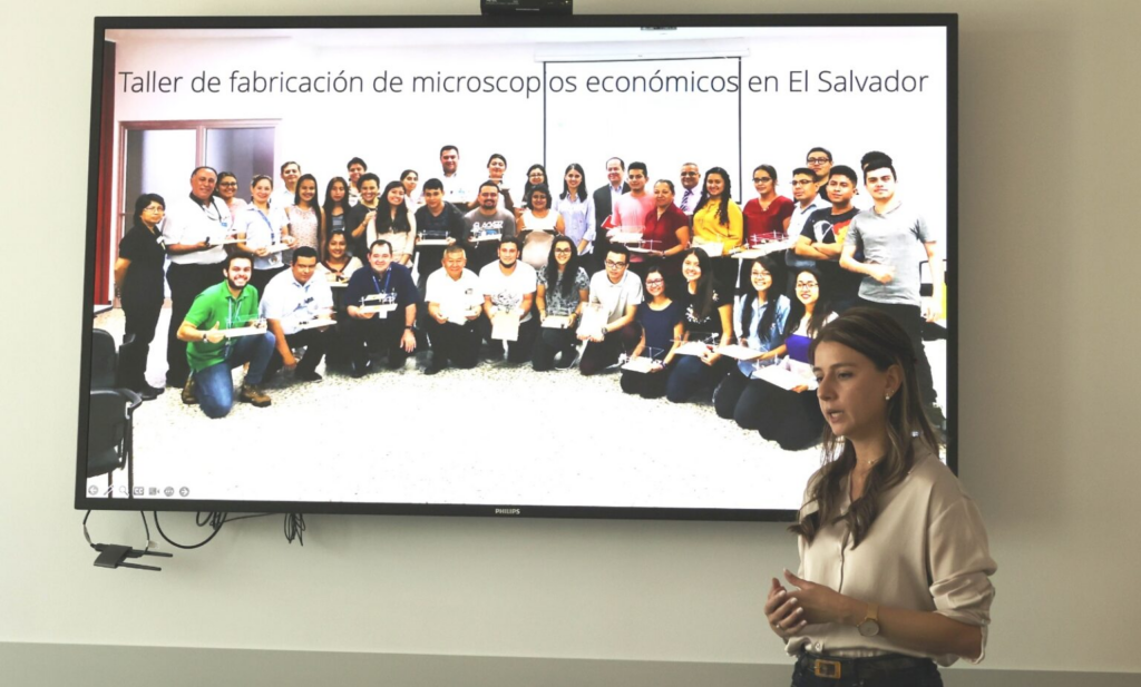 Como parte de estas iniciativas, destacó el proyecto desarrollado recientemente en El Salvador, que incluyó talleres dirigidos a docentes y estudiantes para la construcción de microscopios de bajo costo mediante el uso de herramientas accesibles. Esta acción, impulsada en colaboración con actores académicos locales, fomentó el interés por la ciencia desde edades tempranas y facilitó el acceso al conocimiento científico en contextos con recursos limitados.